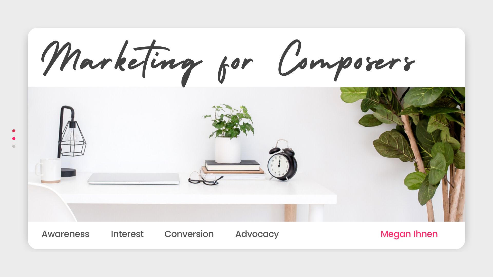 You might be asking yourself: "What is my message? Who is my audience? How do I reach them?" One of the key aspects of creating a sustainable career as a composer is to build your visibility through marketing. You want your ideal collaborators to know that you exist, commission you, and become real advocates of your work! This workshop focuses on concepts such as branding, building awareness, generating interest in collaborations and projects, promoting your upcoming performances, and more.